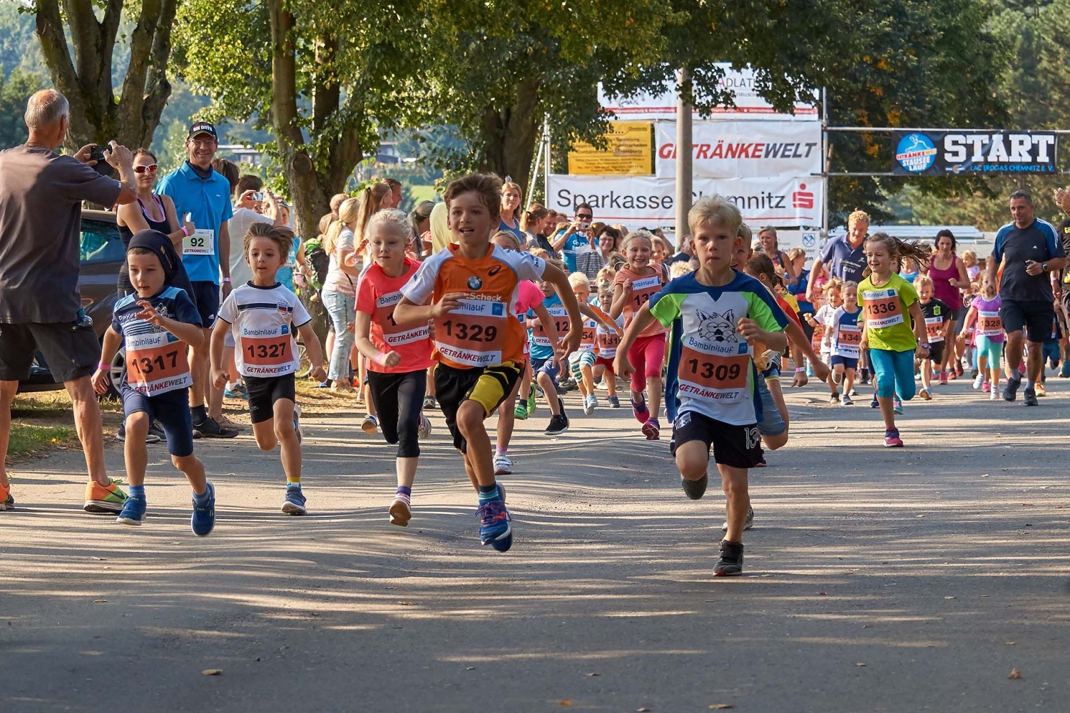 Der erste Start für die Kinder der Altersklassen U8 und U10 erfolgte bereits 16:00 Uhr. Auf dem Kunstrasenplatz wurde hart um die Plätze gerungen. Den Gesamtsieg konnte Tilman Reichel vom TSV 1872 Pobershau in 2:26min vor Jakob von Müller (SC Chemnitz Triathlon, 2:27min) und Lukas Adam (CLV Megware, 2:32min) einfahren. Bei den Mädchen siegte Anne Lilly Eidner vom LV Limbach 2000 in 2:45min vor Saskia Börner (Hetzdorfer SV 1990, 2:50min) und Anne Oelschlägel (Zwönitzer HSV 1928, 2:52min). Beide Gesamtsieger waren auch Erstplatzierte in ihren Altersklassen MK und WK U10. Bei den unter Achtjährigen siegten Tim Hemmerle in 2:53min und Maria Klinnert in 3:12min, beide starten für den Wüstenbrander SV. Auf der 5,5km-Strecke, Wertungslauf im Westsachsen-Laufcup für die Altersklassen U12 bis U16, siegte Tim Herold (M20) für den ASV Erfurt in 18:28min. Beste der Frauen war Lea Harbig vom LV Limbach 2000 (WK U12!) in 23:43min. Der neue “lange” Kanten von 10,1km, seit diesem Jahr wird die 20,6km-Distanz nicht mehr ausgeschrieben, wurde gemeinsam mit der 5,5km-Konkurrenz 17:00 Uhr gestartet und war Cup-Wertungslauf für alle AKs ab U18 aufwärts. Hier konnte Philipp Heisch (M20) von der SG Adelsberg in 33:13min vor Lennart Hermann (M20, Chemnitz, 33:54min) und Philipp Leibelt (M20, Hetzdorfer SV 1990, 33:54min) siegen. Bei den Frauen ging der Sieg in 40:29min an Bärbel Hempel (W45) vom ESV Lok Döbeln vor Anne Gründler (W20, SG Adelsberg, 42:12min) und Mandy Herold (W35, Honda Fugel Sport Team, 45:08min). stre